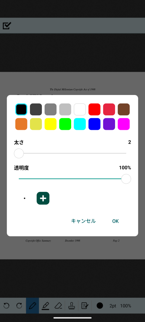 下部ツールバー右側の「線の色」、「線の太さ」、「線の透明度」の部分をタップすると、設定変更ダイアログが表示されます。