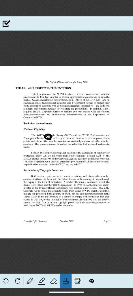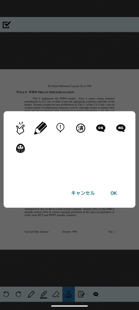 を選択するとボタンがハイライトされ、指でタップした位置にスタンプを押すことができます。下部ツールバー右側には「選択されているスタンプ」のアイコンが表示されます。
