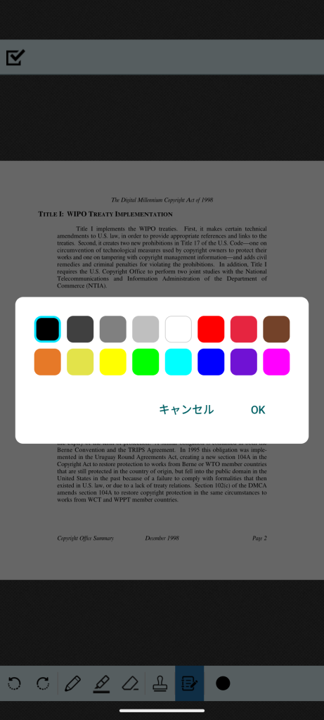 下部ツールバー右側の「メモの色」の部分をタップすると、色の変更ダイアログが表示されます。