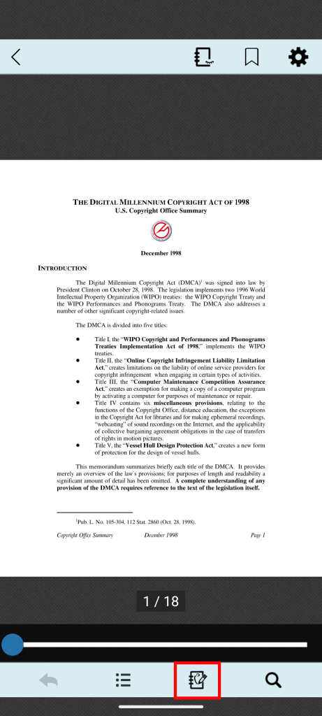注釈編集ボタン。ページ上に注釈を追加することができます。 ※ご利用のアプリ、書籍によって表示されない場合があります。 |